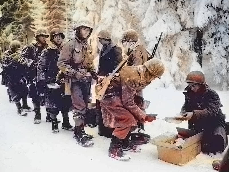 117th Regiment receiving a hot meal during the Battle of the Bulge (U.S. Army Signal Corps - Photo colorized by D. R. Hagberg)