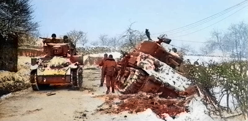 117th Regiment Sherman Tank passing damaged Sherman Tank in Battle of Bulge (U.S. Army Signal Corps - Photo colorized by D. R. Hagberg)