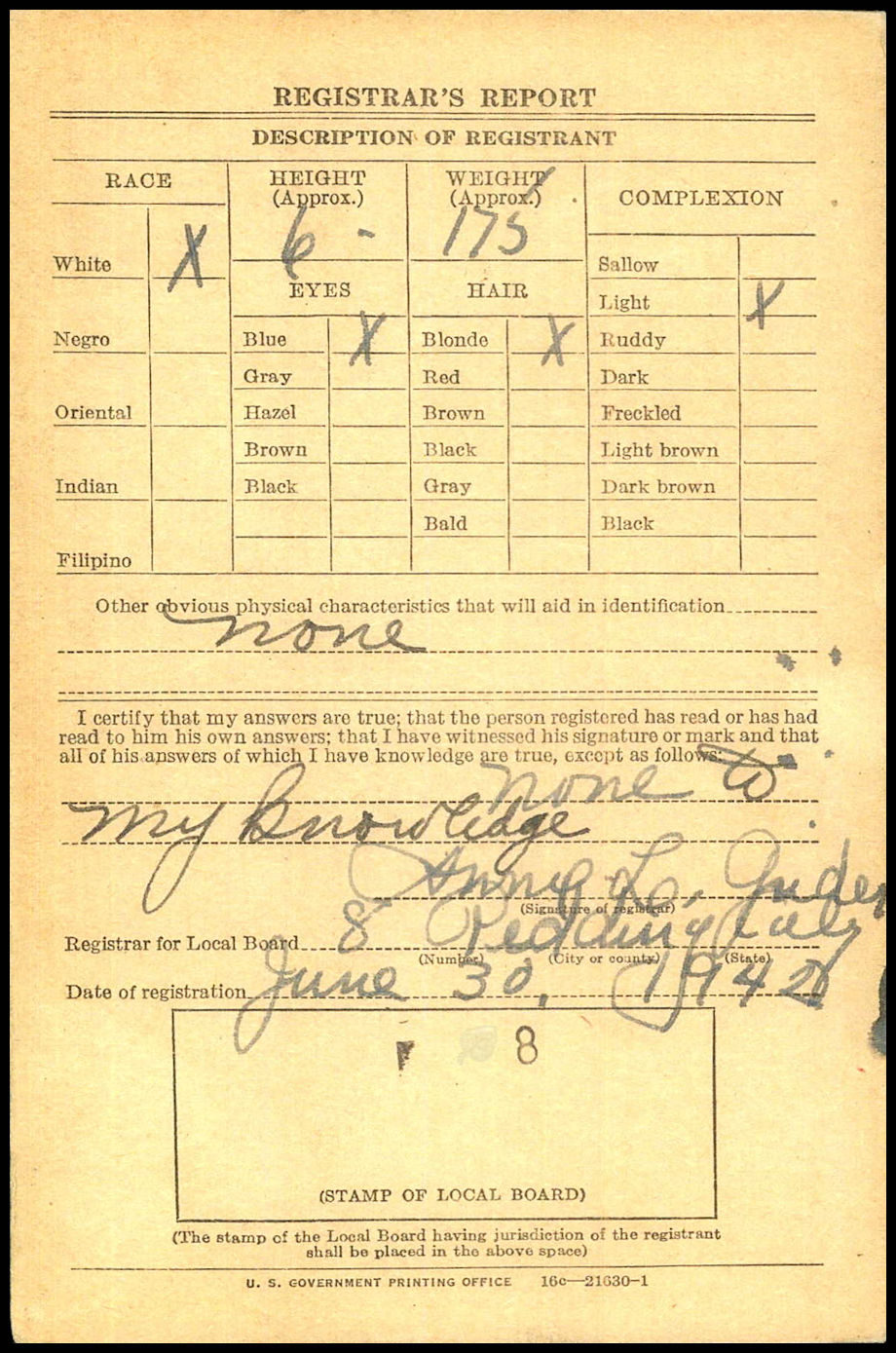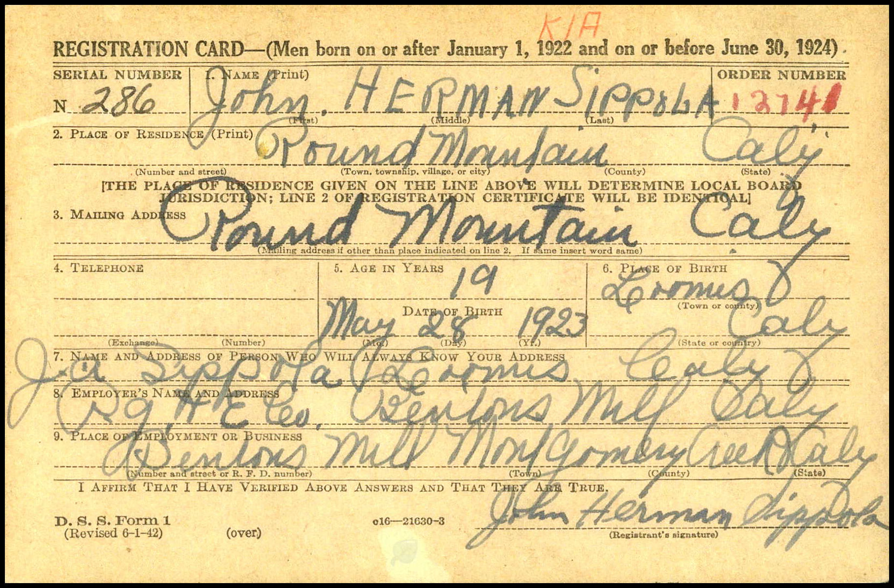 John Sippola's Draft Registration Card - Reverse