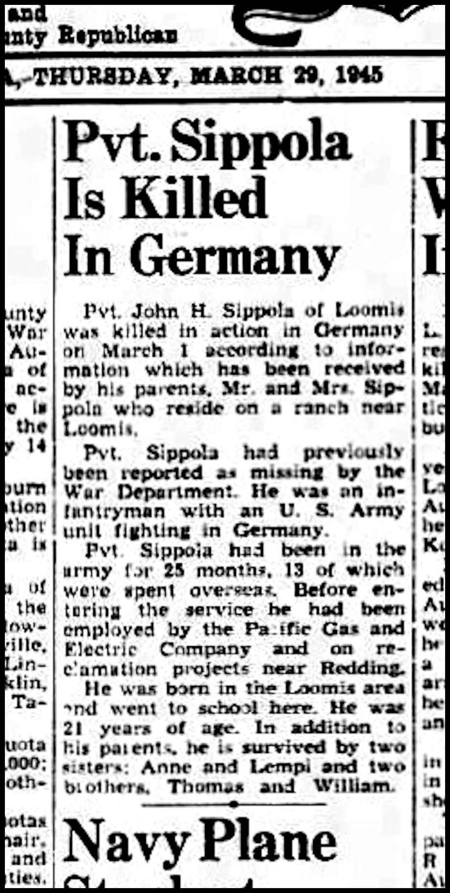 Newspaper article reporting the death of Private John Sippola in Germany (Auburn Journal).