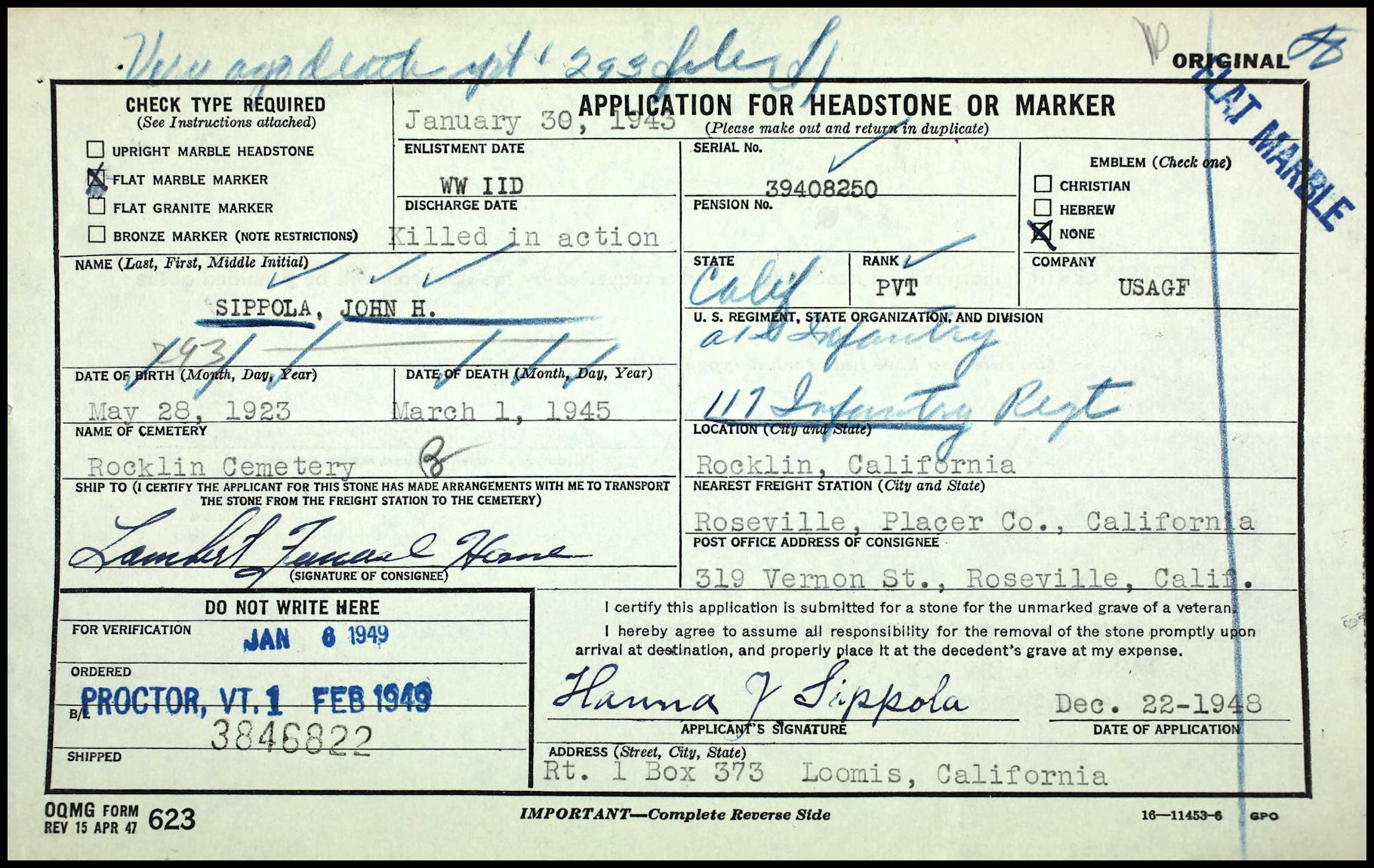 Application for grave marker for Private John Sippola in 1949.