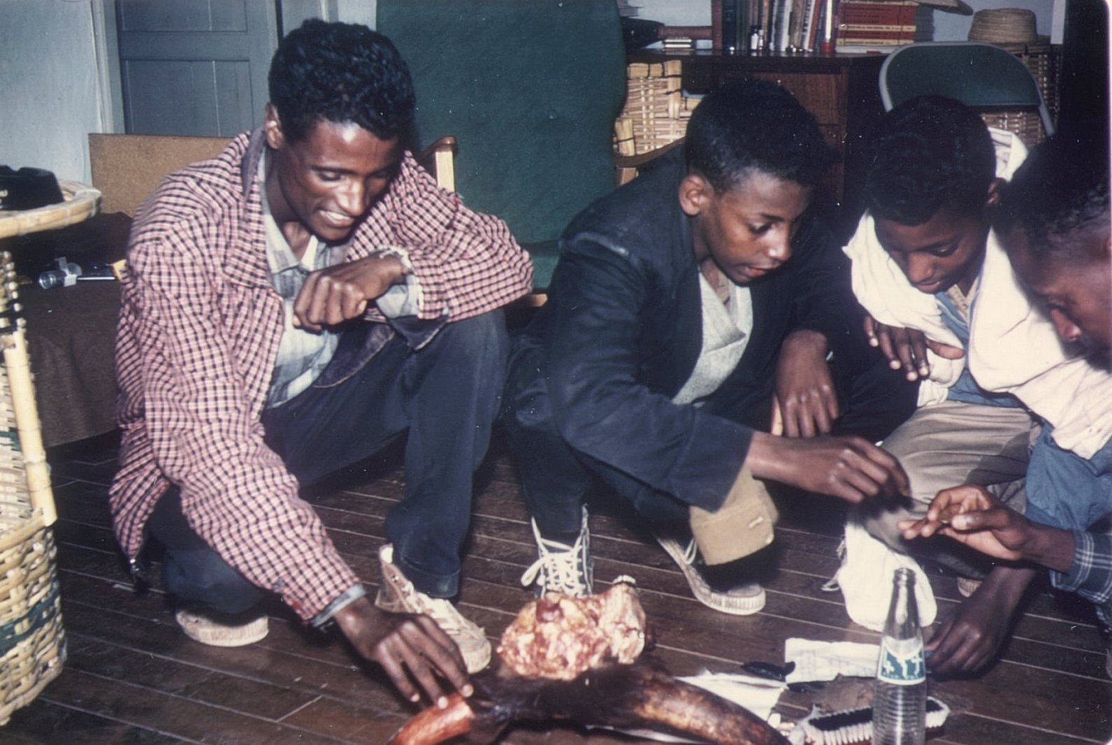 Makonnen, Astatkie, Abera and Lemma showing results from a scavenger hunt in Debre Berhan, Christmas 1964.