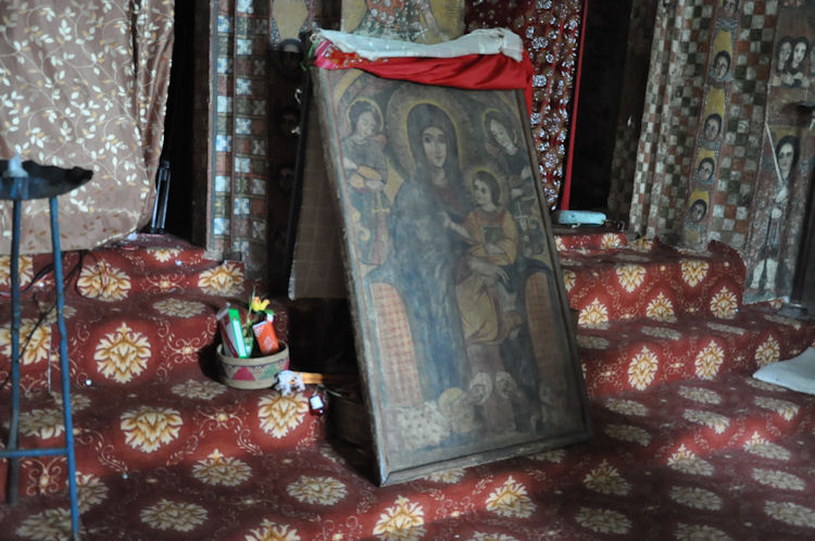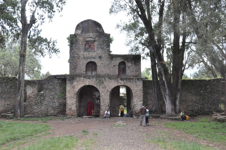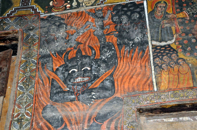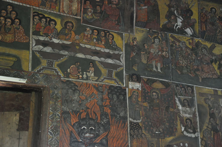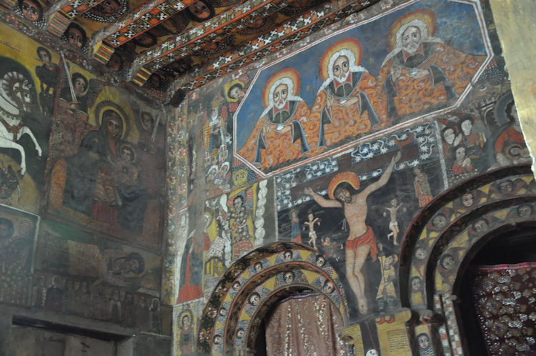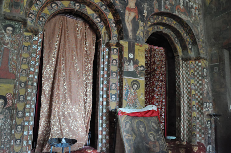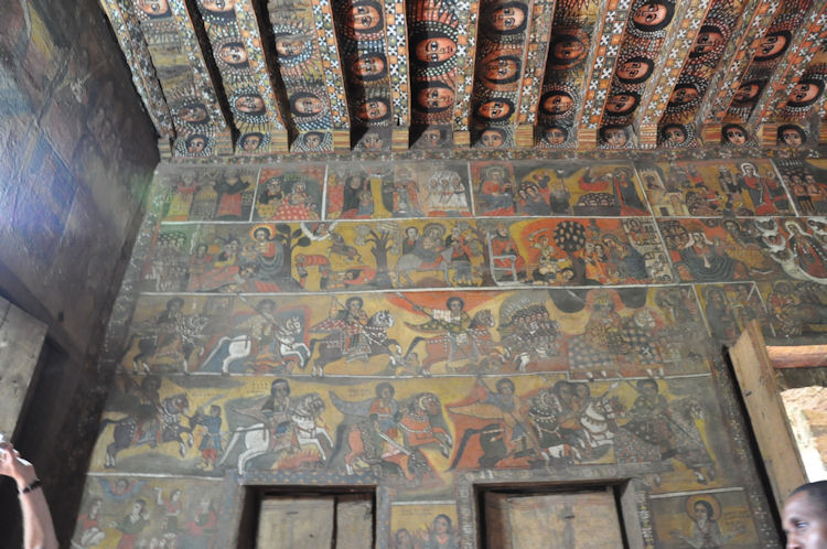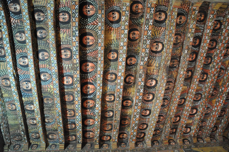 When the Mahdist Dervishes of the Sudan sacked the city of Gondar in 1888, they burned down every church in the city except Debre Birhan Selassie. According to legend, when the Mahdist soldiers approached the church, a swarm of bees descended on the compound of the church and kept the soldiers back, and the Archangel Michael himself stood before the large wooden gates with a flaming sword drawn.