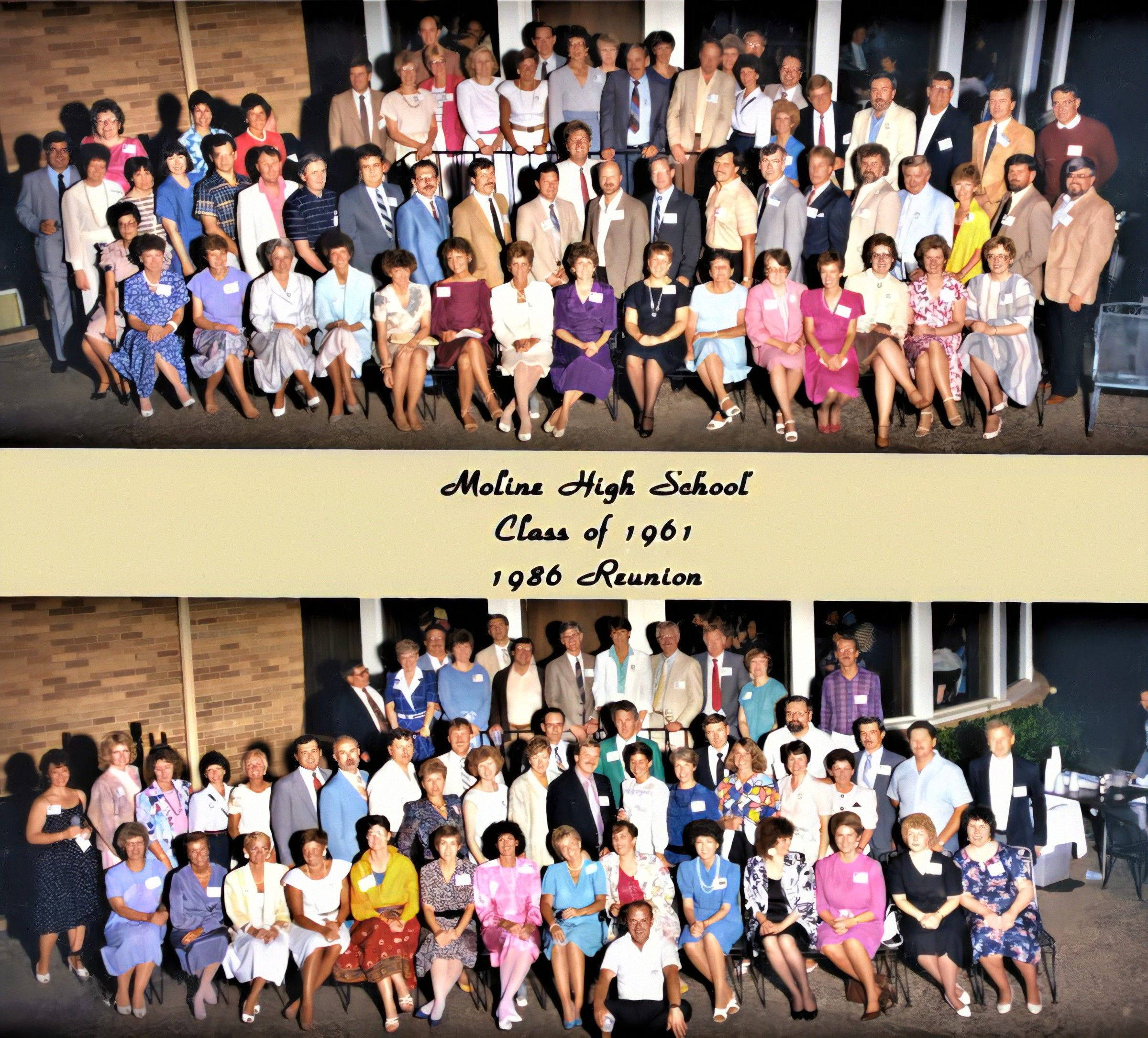 The Moline High School Class of 1961 25th Silver Anniversary Reunion was held on June 6 and 7, 1986. For this reunion, we had a Mississippi River boat ride on the "Princess Riverboat"  out of Moline, Illinois, on Friday, June 6. John Simon provided the music with a baby grand piano from his Moline store. During the cruise on a beautiful summer's evening, hors d'oeuvres and refreshments of beer, wine, and sodas were served. Our main reunion was held on June 7 at Short Hills Country Club in East Moline, Illinois. This was our largest reunion gathering ever with 121 classmates and 88 spouses/guests attending for a total of 209 people. We took 2 group photos, and then had a wonderful buffet dinner. A Dee-Jay provided songs from the fifties and sixties and our classmates danced the night away. This was the first reunion where we used a computer to manage mailings, registrations and name tags.